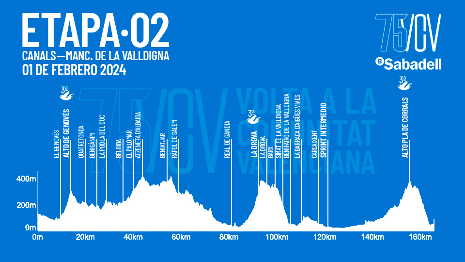 La segunda etapa de 164km sale de Canals y se considera una etapa de media montaña ya que tiene tres puertos puntuables. El puerto de Pla de Corrals, a 10km de meta, parece que será el encargado de alborotar el grupo. Es menos duro que el del día anterior, pero se trata de una bajada técnica, y veremos si algún corredor consigue anticiparse al sprint.