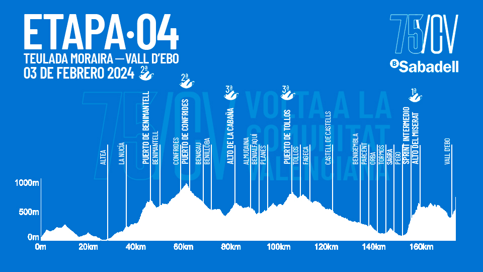 La cuarta etapa es sin duda alguna la etapa reina. Etapa de 175km con final en Vall D´Ebo y 3645m de desnivel. Contará con 5 puertos de montaña y entre ellos, la joya de la corona, el Alto del Miserat, 7,25km al 9,2% de media. Es una alegría ver que este puerto, a priori, será el decisivo de la Volta a la Comunidad Valenciana. Ojo también a la bajada, la primera parte es estrecha y a alguno seguro que le da por arriesgar.
