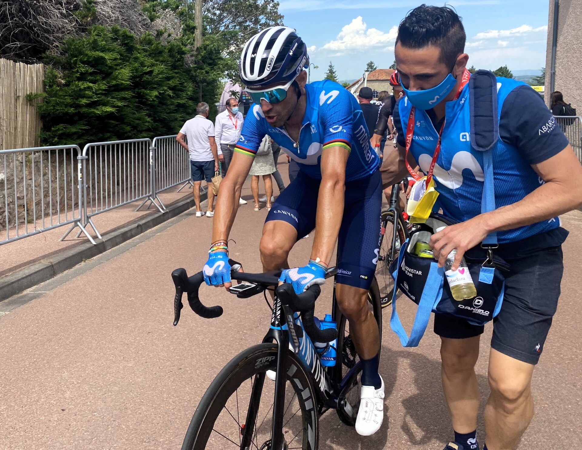 Sí, yo había estudiado Quiromasaje en una academia porque era algo que me gustaba y estaba muy relacionado con el ciclismo. El primer año después de colgar la bici, ya con 28 años entré de masajista con mi equipo, el Comunidad Valenciana. La idea que tenía era compaginarlo con unas oposiciones a bombero, pero después de ese año, en invierno me propusieron ir con la selección española de pista a la Copa del Mundo y otras competiciones. Era una oportunidad de ganar dinero mientras preparaba las oposiciones y probé. Y cuando empezó la temporada de ruta, el equipo de pista solía ir a la Challenge de Mallorca con los profesionales, y allí coincidí con el masajista responsable de la selección nacional de ruta que me propuso hacer con ellos la temporada completa. Para mí fue una oportunidad y una ilusión ir con ellos a pruebas muy bonitas como el Tour del Porvenir. Esto fue en el año 2010, y finalizando esa temporada, Jose Luis de Santos que era el seleccionador nacional me dijo que había entrado un nuevo sponsor (Movistar) en el Illes Baleares y que había habido una pequeña revolución dentro del equipo y tenían vacantes. Jose Luis me preguntó que si me interesaba, él tenía contacto con ellos y podíamos tener la opción. Hablamos con el entonces gerente del Movistar, Alfonso Galilea, le presenté el curriculum y en 2011 ya estuve con ellos toda la temporada. Para mí era un sueño trabajar en el equipo referente de mi juventud, el equipo de Perico y de Induráin, y me reencontré con Alejandro y otros que habían corrido conmigo en categorías inferiores como Rubén Plaza, Beñat Intxausti, Jose Joaquín Rojas, Fran Pérez. Así llegue a la estructura del equipo telefónico y desde entonces trabajo a tiempo completo porque las temporadas son largas y vamos a muchas carreras, rondamos los 180 días de competición al año.