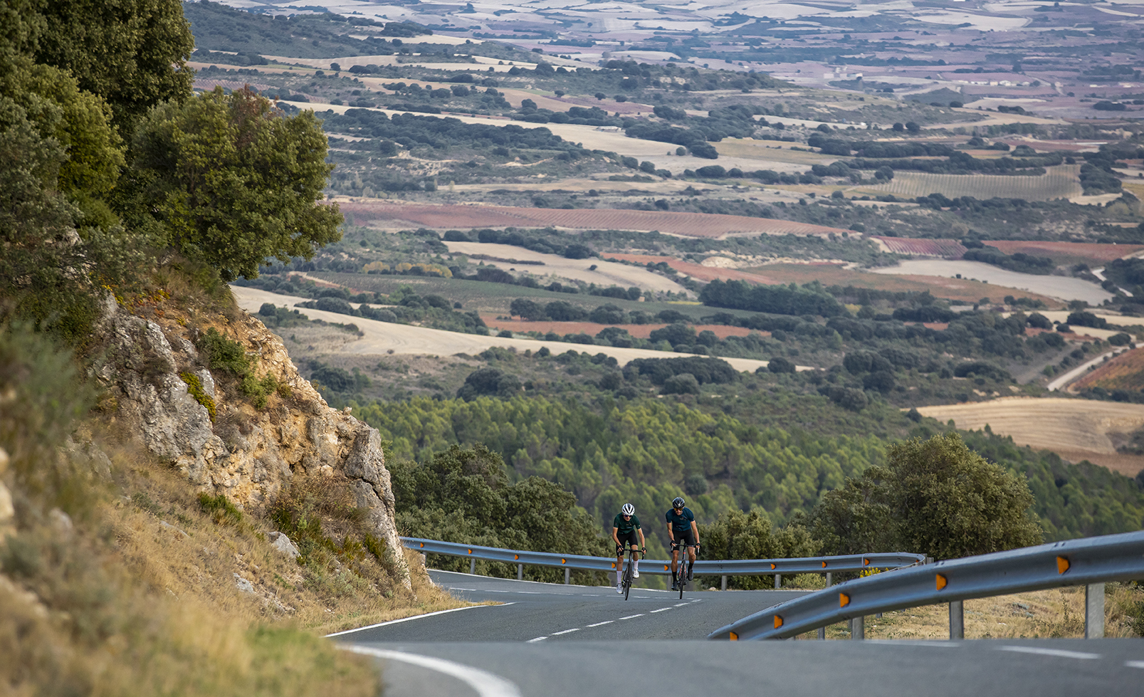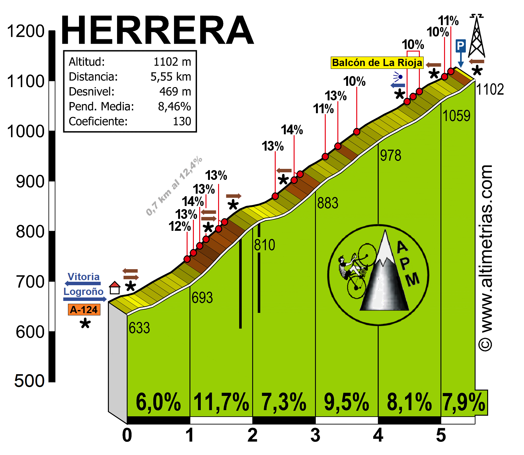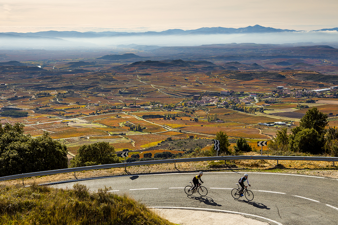 Situado en territorio alavés, la altigrafía que os presentamos es la que asciende desde Leza. Afrontarlo es ya un reto, y nada más desviarnos en el cruce nos espera una tremenda recta con rampas que llegan al 14% que te marcan. Pocos respiros. aunque la pendiente con curvas de herradura que es lo que encontraremos a partir del segundo kilómetro, se lleva mucho mejor. A un kilómetro escaso de la cima, en una pequeña bifurcación a la izquierda, se encuentra el panorámico balcón de La Rioja. Vistas espectaculares con un inmenso mar de viñedos a nuestros pies. Muy recomendable esa paradita.