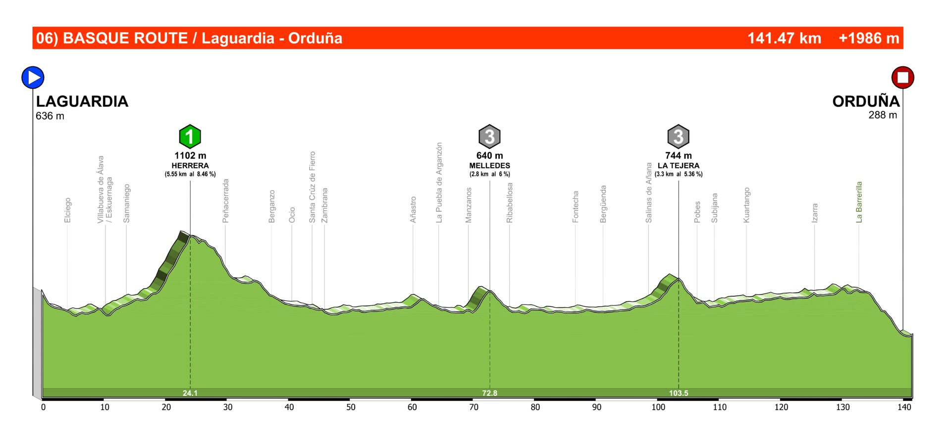 Al puerto de Orduña le ocurre lo mismo que a otros puertos como Herrera. Tuvo gran importancia impulsado por La Vuelta a mediados del siglo pasado, pero cuando esta dejó de venir a las carreteras vascas, entró en el olvido en alta competición. Como dato curioso, comentaremos que Orduña toca en sus dos vertientes tres provincias distintas. Su vertiente dura se inicia en el municipio de Orduña (Bizkaia), a lo largo de su trazado discurre por Araba, y al coronarse se adentra en la provincia de Burgos.